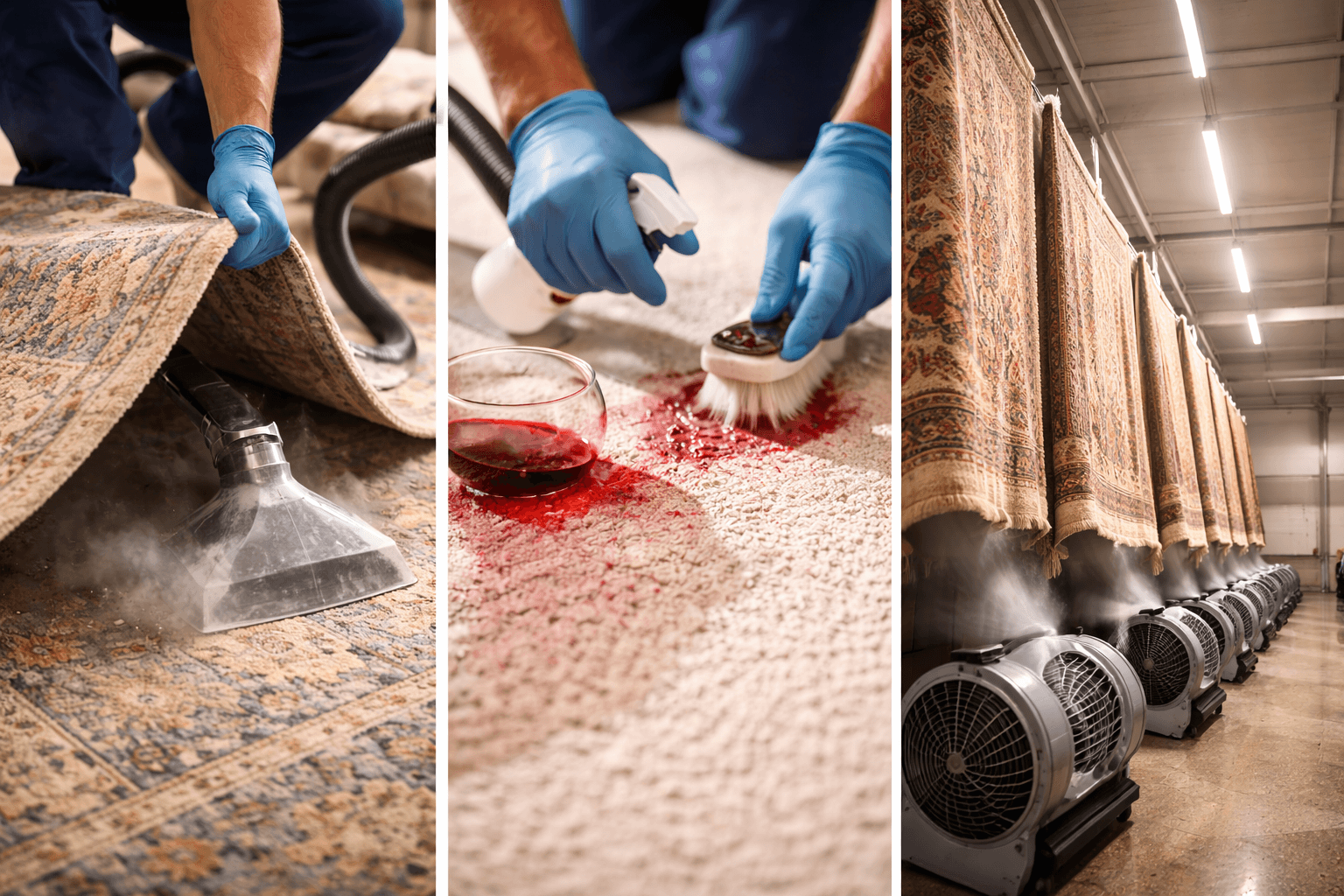 Inspection → Dust extraction → Deep cleaning → Controlled drying → Final finishing