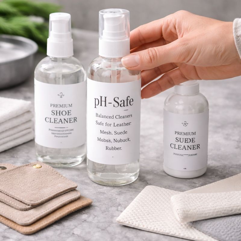 Balanced cleaners safe for leather, mesh, suede, nubuck, and rubber.